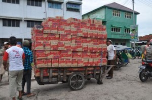 MADI (50) dan Udin (30) buruh Pasar 16 Ilir menurunkan ratusan dus mie goreng merk Indomie dari gerobaknya di toko di Pasar 7 Ulu. Ketika ditanya sejak adanya berita Indomie jenis mie goreng yang mengandung pengawet mereka tidak mengetahui karena sehari-harinya hanya bekerja sebagai buruh angkut. Upah yang mereka dapatkan Rp 50.000 per hari.