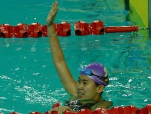 Angelina Soegianto, melambaikan tangan kepada penonton setelah berhasil menjuarai Final 400 meter Surface Putri Fin Swimming SEA Games 2011, di Aquatik Jakabaring Palembang, Senin (21/11/2011). Angelina mencatat waktu tercepat 3:06.74, dan memecahkan rekor baru SEA Games 2011. Tempat kedua diraih Prisilia Gunawan dengan waktu 3:07.74.