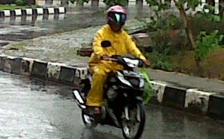 Seorang pengendara sepeda motor memakai jas hujan saat melintas di Jalan Jenderal Sudirman Simpang Polda, Selasa (28/8/2012). Kondisi tersebut disebabkan hujan turun melanda Kota Palembang yang sebelumnya mengalami kemarau sejak beberapa bulan lalu.