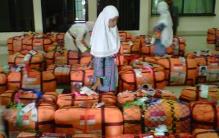 Jemaah haji asal Palembang mencari tas di Aula Asrama Haji Dembarkasi Haji Palembang, Kamis (1/11/2012).