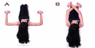 A. Pegang dumbbell 1-2 kg pada masing-masing tangan, lalu berbaring lah di atas bangku, lutut ditekuk, telapak kaki menapak rata di lantai. Rentangkan tangan, tekuk kedua siku, angkat hingga sudutnya setinggi pundak dan membentuk sudut 90 derajat. Saat memegang dumbbell telapak tangan dalam posisi menghadap ke arah depan.