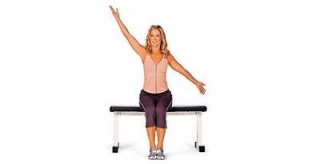Untuk peregangan otot dada, duduk tegak di bangku dengan tangan terentang di depan dada, jari-jari bersentuhan. Tekan tulang belikat merapat dan angkat tangan kanan ke atas sehingga membentuk garis diagonal. Tahan pose ini selama 30 detik. Kembali ke posisi semula dan ganti tangan untuk gerakan berikutnya.
