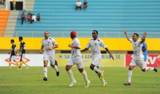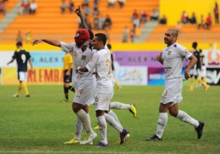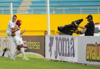 TOPENG SPIDERMAN --- Pemain depan Persita Tanggerang mengenakan topeng spiderman melakukan seleberasi setelah berhasil membobol gawang PSPS Pekanbaru, pada laga Inter Island Cup 2012 di Stadion Gelora Sriwijaya Jakabaring, Minggu (9/12/2012). Persita akhirnya unggul dengan skor 1-0 hingga peluit ditiup wasit.