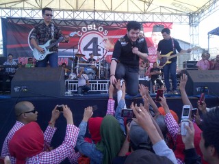 SRIPOKU.COM, MUARAENIM - Ridho Rhoma goyang massa kandidat Cabup & Cawabup Muaraenim Syahril Djemalip-Giri Ramanda Kiemas (SGM), pada putaran terakhir kampanye Akbar SGM, di Lapangan eks Mandiri Tanjungenim, Jumat (1/3/2013) sekitar pukul 15.45.