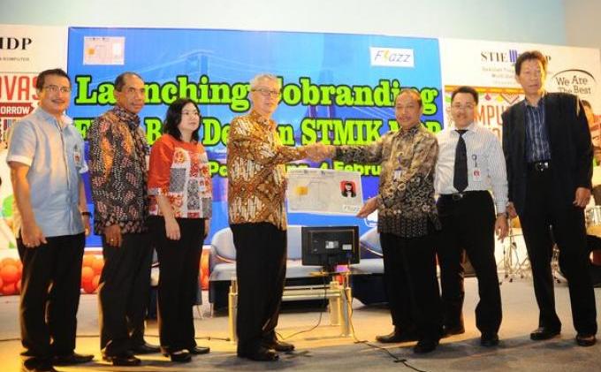 Peluncuran ditandai dengan penyerahan contoh kartu Flazz kepada Ketua STIMIK MDP, Rusbandin oleh Kakanwil VI BCA, Darmawan.