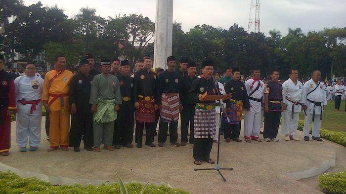 SRIPOKU.COM, PALEMBANG -- Sebanyak 3.000 pendekar yang tergabung dalam Komunitas Beladiri Provinsi Sumsel siap mendukung dan mensukseskan ASEAN University Games XVII di Palembang di Halaman Kantor Gubernur Sumsel, Minggu (30/11/2014).