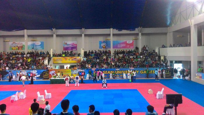 Hampir di setiap sudut tribun disesaki oleh ratusan penonton, mulai dari anak-anak, mahasiswa sampai orang tua nampak sangat antusias menyaksikan cabor yang dominan menggunakan kaki tersebut. Cabor taekwondo berakhir hari ini.
