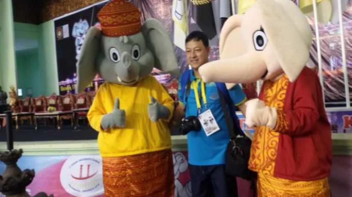 Seorang ofisial karate dari Malaysia foto bersama maskot UDG Bona dan Boni di ruang pertandingan usai penyerahan trofi pemenang ASEAN University Games 2014 di Jakabaring Sport City (JSC) Palembang, Sumsel, Sabtu (13/12/2014).