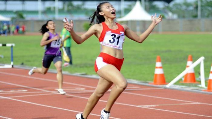 Atlet Lari Gawang Putri Indonesia, Emilia Nova, selebrasi setelah berhasil mencapai garis finis dengan mencatat waktu tercepat, 13,69 detik