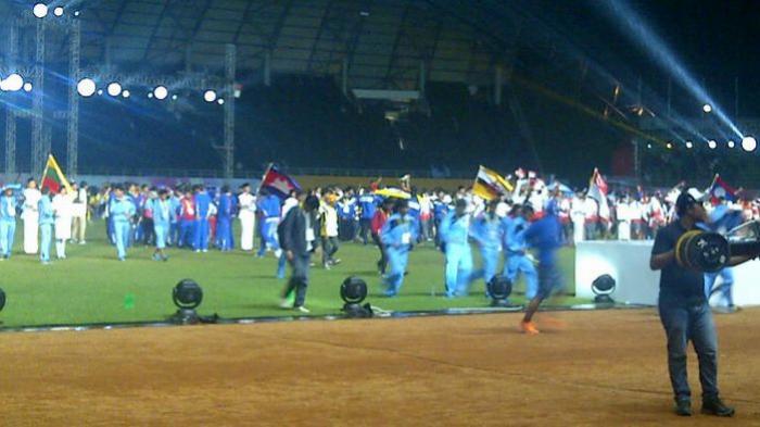 Sebagian penonton,panitia dan atlet yang ada di tengah lapangan berlari terbirit-birit menyelamatkan diri dari hujan pada penutupan AUG 2014