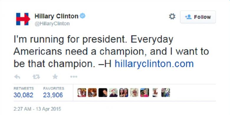 "I'm running for president. Everyday Americans need a champion, and I want to be that champion. –H https://www.hillaryclinton.com," demikian tweet di akun @HillaryClinton.