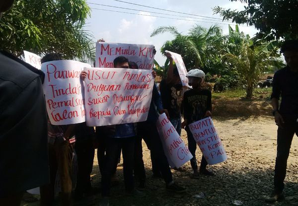 Para mahasiswa yang tergabung dalam Pemuda Mahasiswa Untuk Pilkada PALI Bersih Sumatera Selatan ini, menuntut pengungkapan dugaan kecurangan Pasangan Calon (Paslon) jalur Independen yang memalsukan data dukungan melalui Kartu Kartu (KK) dan KTP sebagai syarat untuk maju di Pilkada PALI.