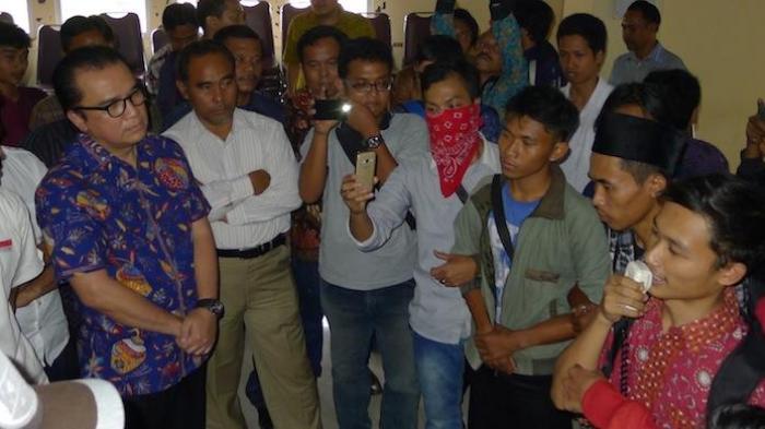SRIPOKU.COM, SERANG - Demonstran dari mahasiswa Institut Agama Islam Negeri Sultan Maulana Hasanuddin, Serang, Banten mengusir Anggota Komisi I DPR Tantowi Yahya.