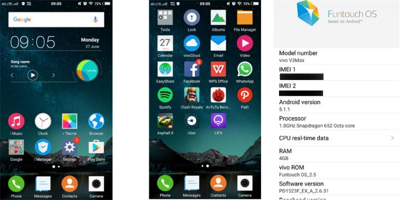 Tampilan homescreen Vivo V3 Max dan versi Android yang digunakan
