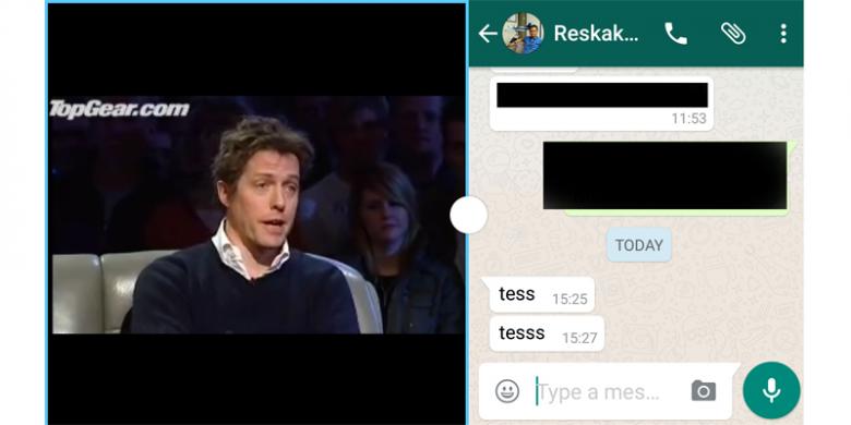 Ketika logo WhatsApp diklik, layar terbelah dua, sisi kiri tetap menampilkan video dan sisi kanan menampilkan layar WhatsApp. Tidak hanya bisa membaca pesan yang masuk, KompasTekno pun bisa langsung membalas pesan tersebut sambil tetap menyaksikan pemutaran video.