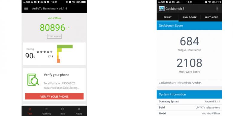 Sementara itu, saat diuji dengan Geekbench 3, Vivo V3 Max bisa mencapai skor 684 untuk single-core dan 2.108 untuk multi-core.