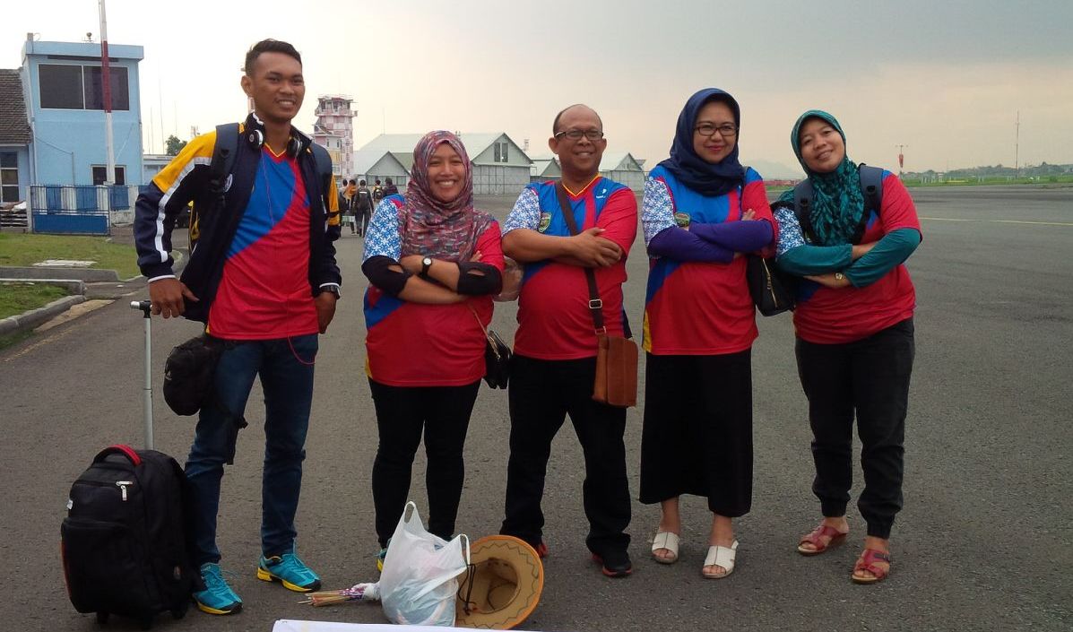 SRIPOKU.COM, PALEMBANG - Kontingen Sumatera Selatan (Sumsel) rata-rata telah tiba di Bandung Jawa Barat. Ada yang telah mulai berlaga seperti cabor sepakbola, dayung, catur dan poloair. Pada Kamis (15/9/2016) ada lima cabor yakni, Wushu, Karate, Bowling, Ski Air, dan Panjat Tebing baru tiba di Bandara Husein Sastranegara bandung.