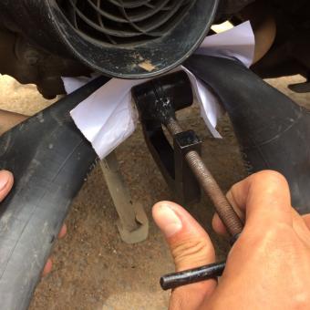 Di bagian bawahnya terdapat tuas untuk memutar besi berulir yang menjepit ban.