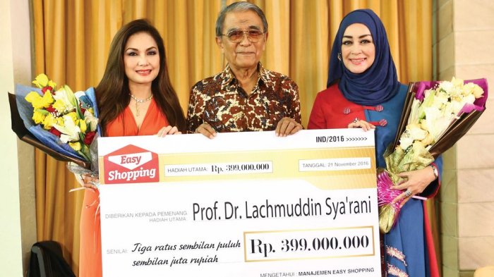 “Saya kebetulan sudah punya yayasan khusus yang akan menampung sebagian hadiah yang saya dapatkan. Uang senilai Rp 399.000.000 ini sangat besar dan besar harapan saya juga agar hadiah ini bermanfaat bagi orang-orang yang membutuhkan”, ujar Lachmuddin, pemenang hadiah utama Easy Shopping. Profesor yang merupakan pensiunan dosen salah satu perguruan tinggi ternama ini mengatakan bahwa orang pandai harus belanja di “Easy Shopping” dan hanya orang-orang pandai yang bisa menang.