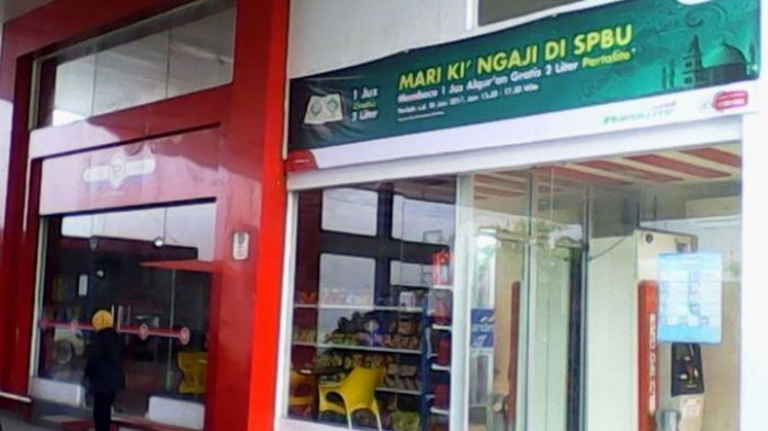 PT Pertamina menggratiskan 2 liter Pertalite kepada pelanggan sehabis mengaji 1 juz Al Quran di beberapa SPBU di Indonesia hingga 24 Juni mendatang. Program ini merupakan program tahunan setiap bulan ramadhan yang dimulai pukul 15.30-17.30 Wita.