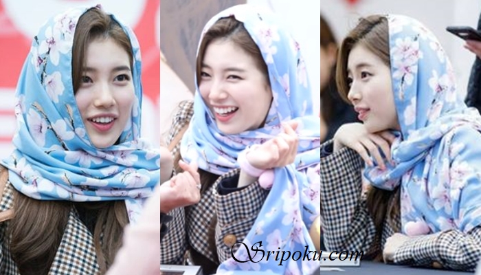 Dalam fansign tersebut, Suzy terlihat mendapat hadiah hijab dari seorang fans.