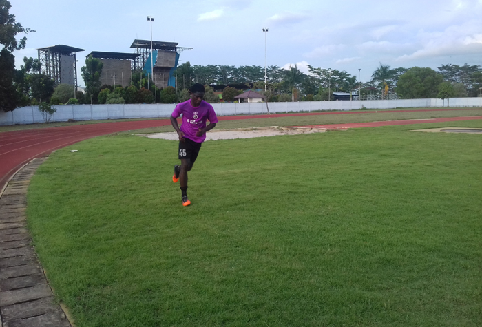 Teks foto: Stopper Sriwijaya FC Bio Paulin saat menjalani sesi latihan di Stadion Atletik Jakabaring Palembang, beberapa