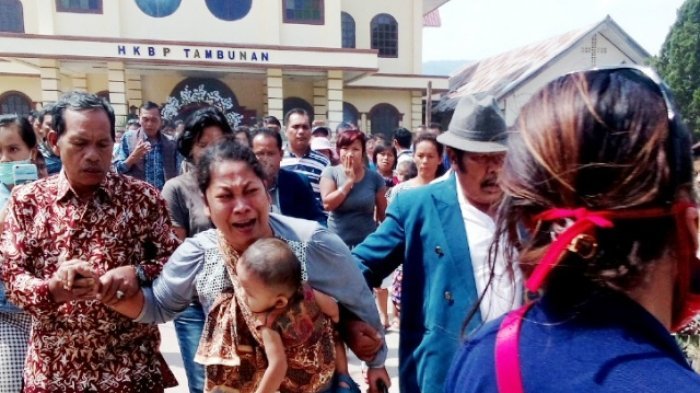 Helen menangis tersedu meninggalkan gereja HKBP Tambunan.