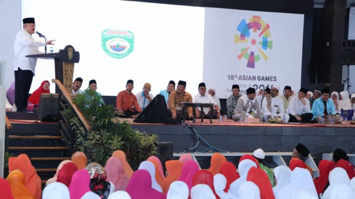 PALEMBANG - Gubernur Sumatera Selatan (Sumsel) H. Alex Noerdin menghadiri Tabliqh Akbar dalam rangka Peringatan Isra Mi’raj Nabi Muhammad SAW sekaligus menyambut bulan suci Ramadhan 1439 H dan sosialisasi Asian Games 2018 bersama Ormas Islam se-Sumatera Selatan di Griya Agung, Sabtu (28/4).