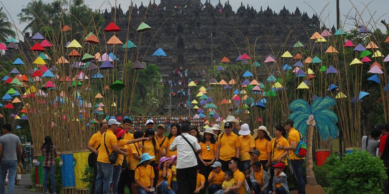 Sejumlah wisatawan berofoto di area seni instalasi bambu di jalan masuk komplek Taman Wisata Candi (TWC) Borobudur, Magelang, Jawa Tengah, Selasa (12/6/2018). Pihak TWC Borobudur menargetkan 356.747 wisatawan selama 12 hari libur Idulfitri 2018 atau naik 7,5 persen naik dari target tahun 2017. (ANTARA FOTO/ANIS EFIZUDIN)