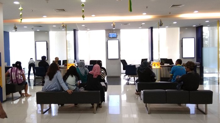 "Transaksi setor tunai dan layanan di customer service ramai pada hari pertama layanan normal." katanya.