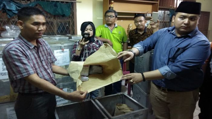"Telah ditemukan kotak suara yang telah dibuka, di wilayah Kelurahan 10 Ilir, semua terbuka sebanyak 22 kotak namun disegel kembali. Dan yang belum ditutup atau barang bukti ada dua kotak masing-masing kotak suara Palembang dan Gubernur," jelas Ketua Advokasi Sarimuda-Abdul Rozak, Riski Saputra.