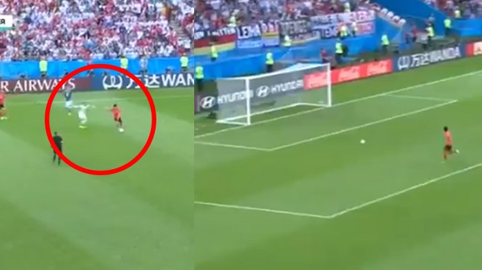 Bola bergulir ke daerah pertahanan Jerman yang kosong melompong tanpa kiper.