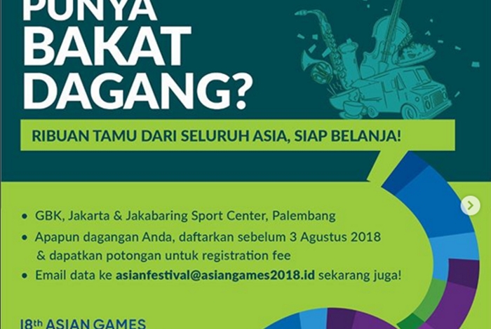 "#AsianGames2018 membuka peluang usaha buat kamu yang punya bakat dagang. Yuk, daftarkan usaha kamu, dan jadilah bagian dari 18th Asian Games Asian Fest di GBK, Jakarta, dan Jakabaring Sport Center, Palembang!"