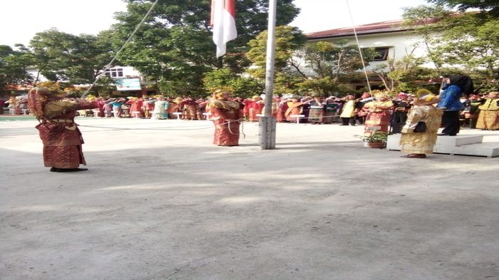 Jika setiap upacara hari Senin diikuti dengan seluruh siswa dan guru dengan seragam lengkap, maka kali ini para siswa memakai baju adat