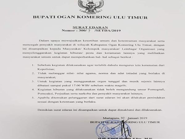 "Apabila ditemukan pelanggaran dari SE ini maka akan diberikan penindakan sesuai dengan ketentuan yang berlaku," isi SE yang ditandatangani langsung oleh Bupati OKU Timur HM Kholid MD tanggal 30 Januari 2019 tersebut.