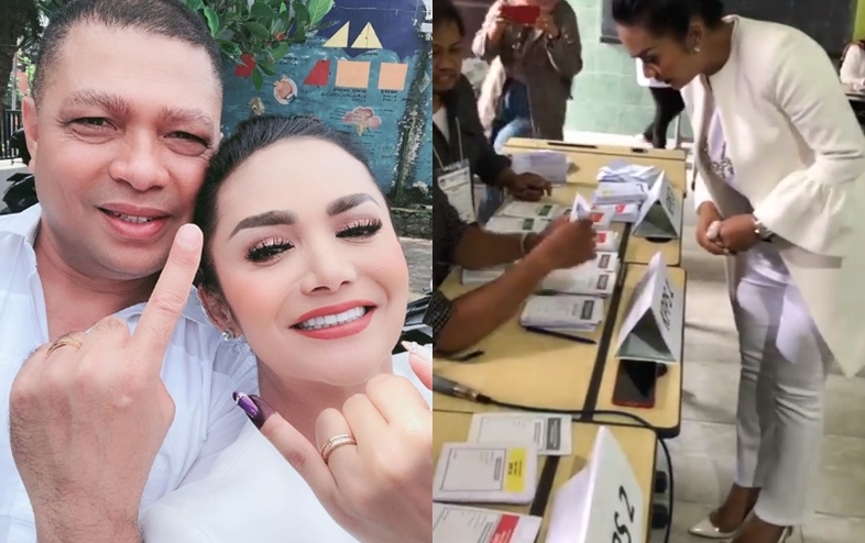 Krisdayanti dan Raul Lemos nampak hadir ke TPS dengan mengenakan busana yang senada, yakni berwarna putih.
