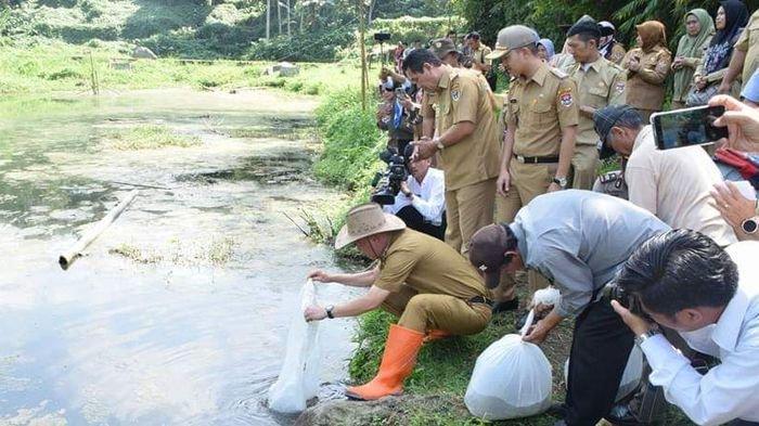 Walikota Alpian Maskoni secara simbolis membagikan sekaligus menebar benih ikan dan ikan mas sebanyak 30 ribu benih di tiga lokasi berbeda, Selasa (16/7/2019).