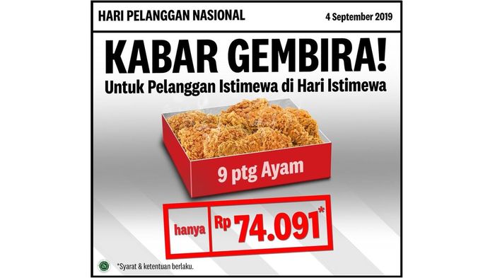 Promo berupa paket sembilan potong ayam yang dihargai Rp 74.091. Paket ini berlaku khusus pada Kamis (4/9/2019), di seluruh KFC Indonesia, berlaku makan di tempat, bungkus, drive thru, KFC bandara dan KFC box. Tidak berlaku untuk KFC Catering dan pengantaran ke rumah. Satu orang hanya boleh membeli maksimal dua paket.