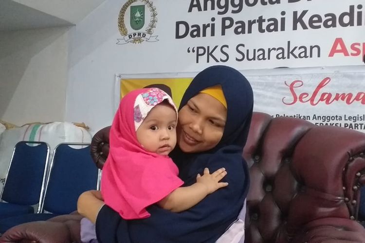 Nurlela dan bayinya berada di posko pengungsian di Kantor DPW PKS Riau di Pekanbaru, karena terpapar kabut asap karhutla, Minggu (15/9/2019) malam. (KOMPAS.COM/IDON)