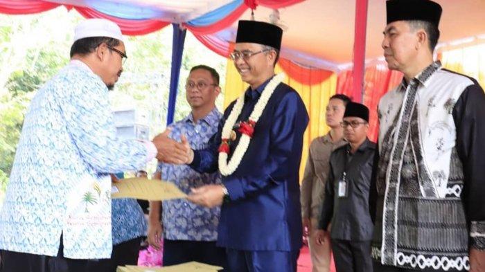 SK kenaikan pangkat diserahkan langsung oleh Bupati Musirawas H Hendra Gunawan saat melantik enam Pjs Kades, yang dipusatkan di Desa Remayu Kecamatan Tuah Negeri, Sabtu (14/9/2019). Penyerahan SK kenaikan pangkat PNS langsung kepada yang bersangkutan ini sesuai dengan Program Empati yang dilaksanakan oleh Badan Kepegawaian dan Pengembangan