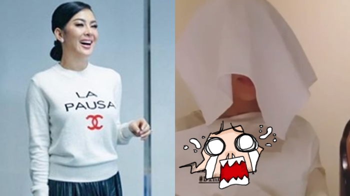 Syahrini tampak menutupi kepada, wajah dan bagian depan pakaiannya dengan kain berwarna putih.