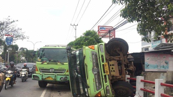 Ketika sopir tidak bisa mengendalikan laju truk, akhirnya menabrak besi pembatas DAM yang ada di dekat Bank Sinar Mas Basuki Rahmat.