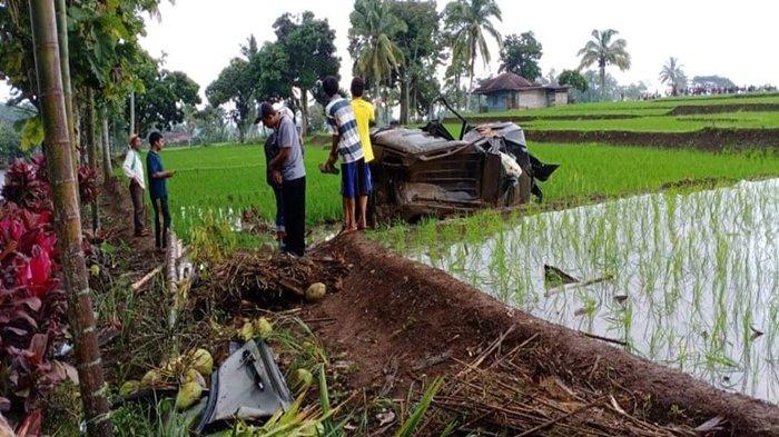 Namun diduga hujan dan jalan licin, kendaraan yang ditumpangi terbalik hingga masuk ke area sawah.