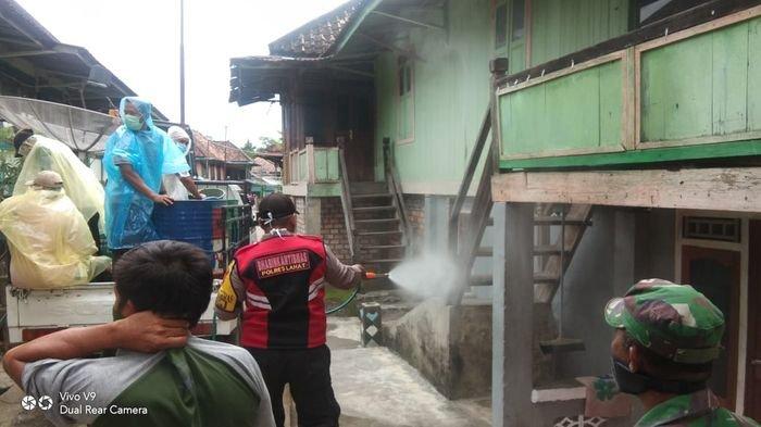 Warga bersama perangkat desa, kecamatan dan bhabinkamtibmas Polsek Merapi Barat, secara kompak melakukan penyemprotan dengan disinfektan yang didapat dari swadaya.