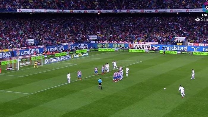 Dari jarak sekitar 35 meter, dengan posisi bola agak di tengah lapangan, Ronaldo melepaskan tembakan keras yang melewati pagar hidup dan bersarang di sisi kiri gawang Thibaut Courtois.