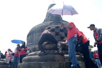 Dan inilah salah satu yang sering dilakukan wisatawan Candi Borobudur adalah merogoh stupa untuk menyentuh patung Buddha yang ada di dalamnya.