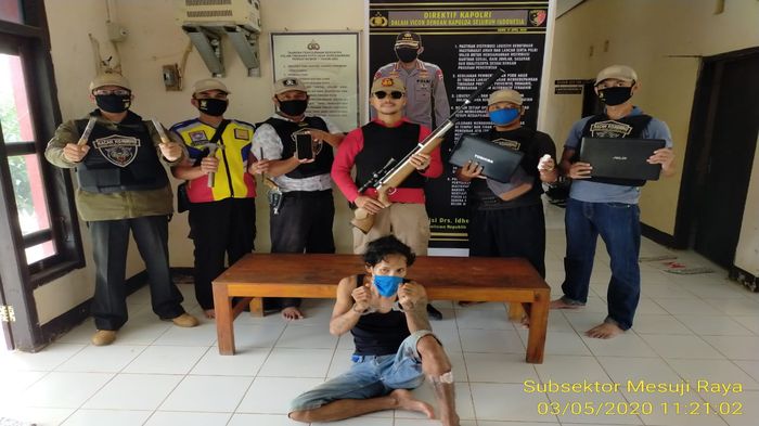 Pelaku dan barang bukti satu buah senapan angin, dua buah laptop, dua unit handphone, tiga buah besi pencongkel, satu buah obeng, satu buah palu besi telah dibawa dan diamankan di Subsektor Mesuji Raya.