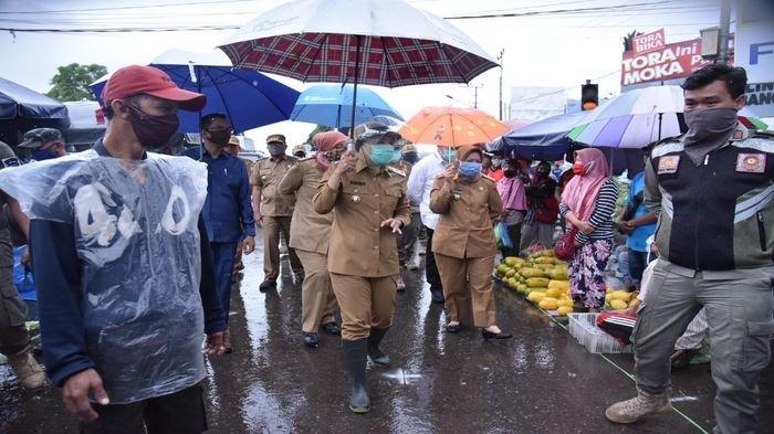 SRIPOKU.COM, PALEMBANG - Meski di tengah kondisi hujan, edukasi yang diberikan terhadap para pedagang tetap dilakukan oleh Pemerintah kota Palembang melalui Wakil Walikota Palembang, Fitrianti Agustinda di Pasar Lemabang Palembang, Selasa (5/5/2020).