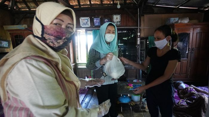 Bantuan paket sembako dibagikan langsung Feby Deru bersama Fauziah Mawardi ke rumah warga tak mampu di kelurahan Ogan Baru, seperti Samsudin yang sehari-harinya menarik becak, juga Siti Zumaroh janda 5 anak yang tampak tak berdaya terbaring lemah di tempat tidur karena sakit.