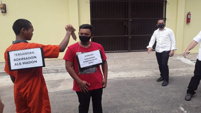 Rekontruksi penusukan yang berujung pembunuhan itu disaksikan pihak keluarga korban dan pihak keluarga pelaku.